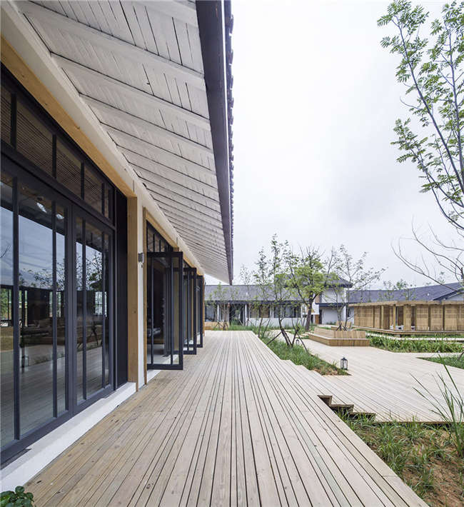 在建筑的形式上,我们尽量低调处理。景观于建筑的关系是“湿地里的屋子“,而不是”建筑配套的湿地”。我们没有建造一栋巨大的高楼,取而代之的是将一至二层的小房子规划成5片分布在园区内。接待、餐厅、客房、spa、别墅等,各自散落,但又有栈道连接。整个酒店更像是一个湿地中的小村落。灰白色的涂料,风干的松木,纤细的铁扶手、简单的斜屋顶以及通透的大玻璃几乎已经是建筑外观上所有的元素了。去除了不必要的修饰,朴实的小屋自然的融入了湿地的大环境。