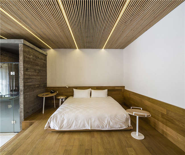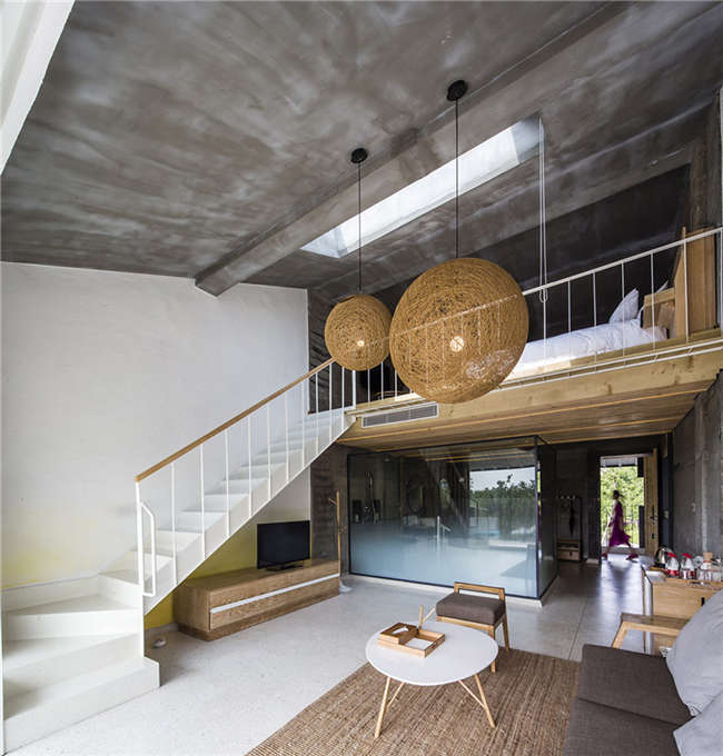 我们利用坡顶小屋的建筑格局,创造了将近十余种房型的客房。形式多样,有平层,错层,跃层,还有两层的8人通铺。为了保证客房的空间能最大化的通透,我们在所有的房型内设置大面积的立隔墙分割空间,即使是卫浴设备我们也采用家具方式将其独立的放置在房间内,然后以通透的玻璃稍加以阻隔。